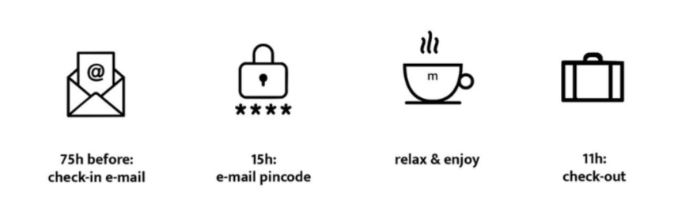 U checkt binnen op uw eigen tempo, zonder wachtrij of receptie.